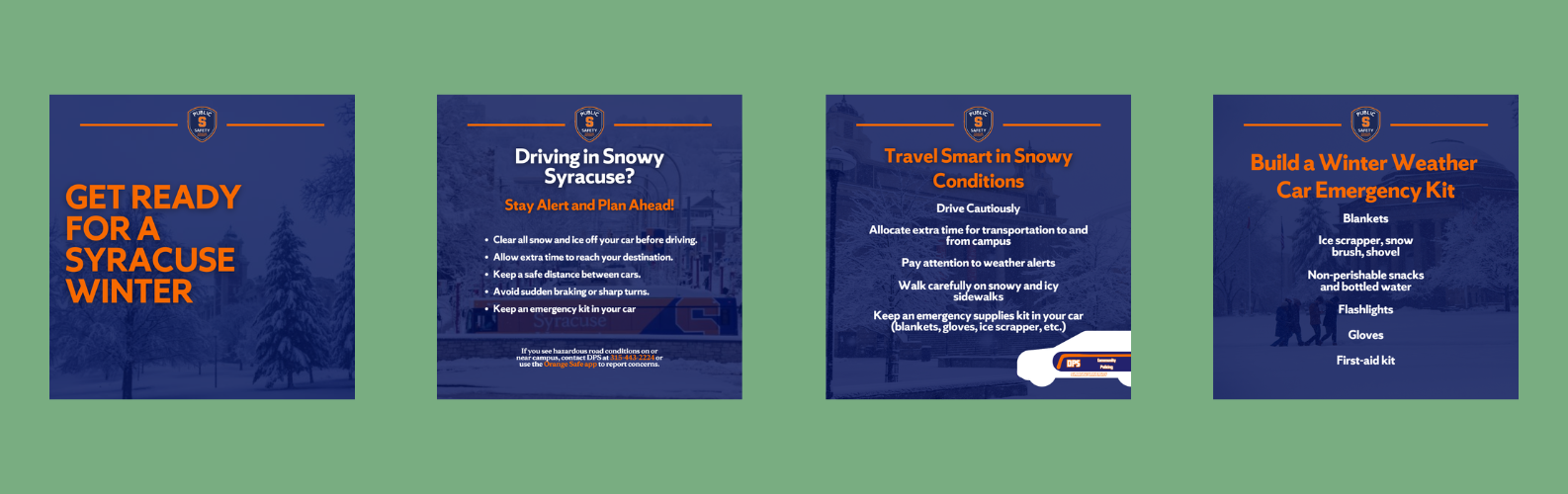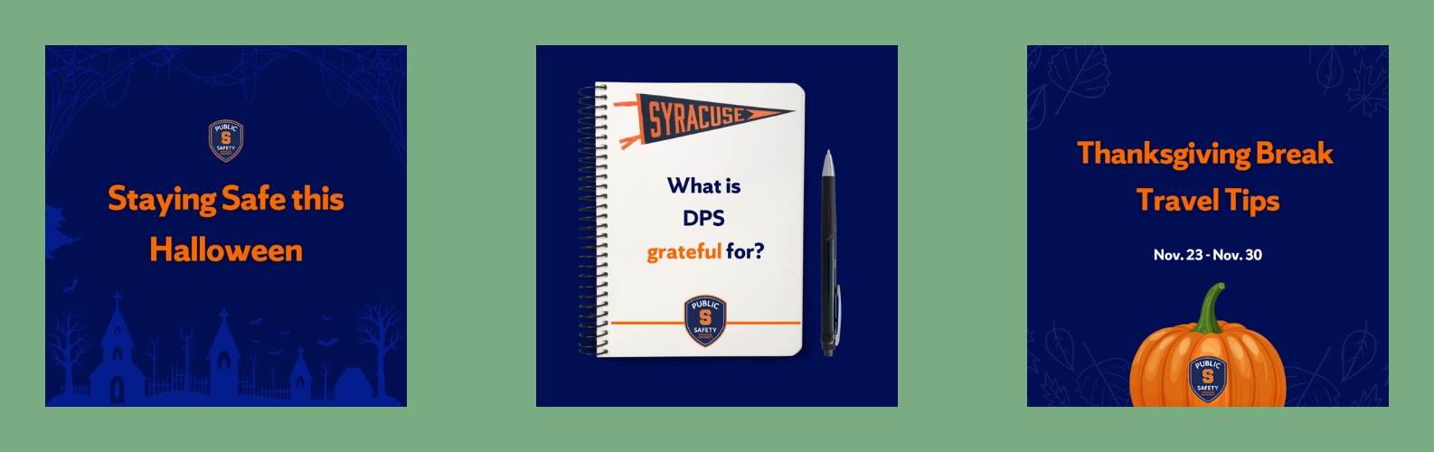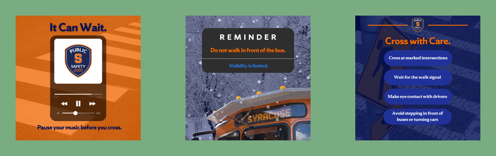 I created a safety tip series for the Department of Public Safety that covered topics such as pedestrian awareness, and break reminders like locking doors and unplugging electronics. One post in the series performed exceptionally well and received higher-than-average engagement, showing how clear visuals and practical messaging can make safety information more relevant to students.