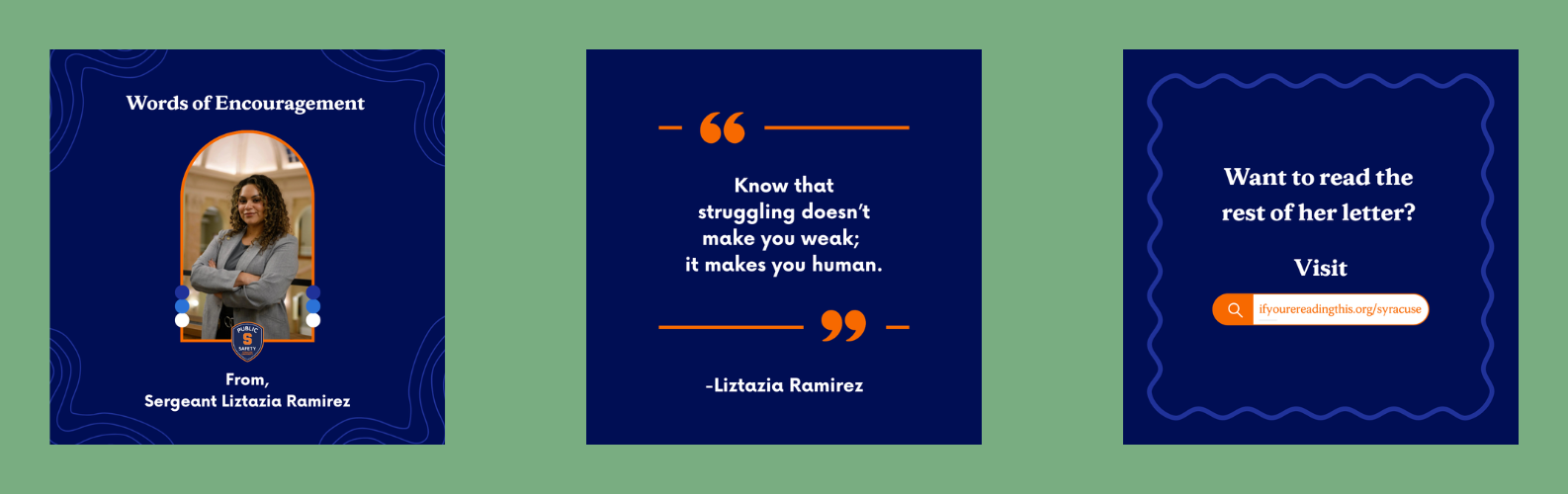 “If You’re Reading This…” is a student-run mental health initiative at Syracuse University that invites students, faculty, and staff to write anonymous letters of encouragement. My role was to bring the Department of Public Safety into the project in a thoughtful, human way. I facilitated an officer’s participation, developed the messaging and story angle, and guided the content capture to ensure the activation felt authentic, empathetic, and aligned with the project’s mission of reducing stigma. The goal wasn’t to spotlight DPS, but to show shared vulnerability and strengthen community trust through honest storytelling.